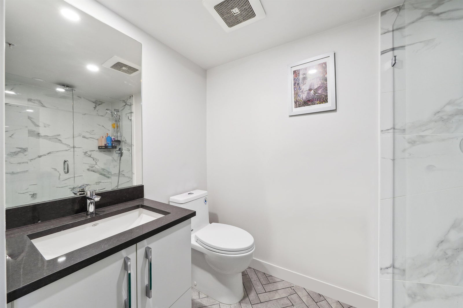 INVESTOR ALERT! Introducing "Midtown Central" by PortLiving, where modern living meets urban convenience. This spacious corner unit boasts 2 bedrooms, 2 bathrooms, and engineered hardwood flooring throughout. The open concept design invites natural light and offers stunning North Shore Mountain views from your private covered balcony. Enjoy cooking in the kitchen equipped with high-end appliances, quartz countertops, and a Carrara polished backsplash. Located in a walkable community, residents have easy access to restaurants, grocery stores, and public transit. Convenience is key with included parking, storage, and a bike locker, making "Midtown Central" the perfect blend of comfort, style, and accessibility in the heart of the City. OPEN HOUSE, SUN, JAN 11TH, 2:30-4PM.